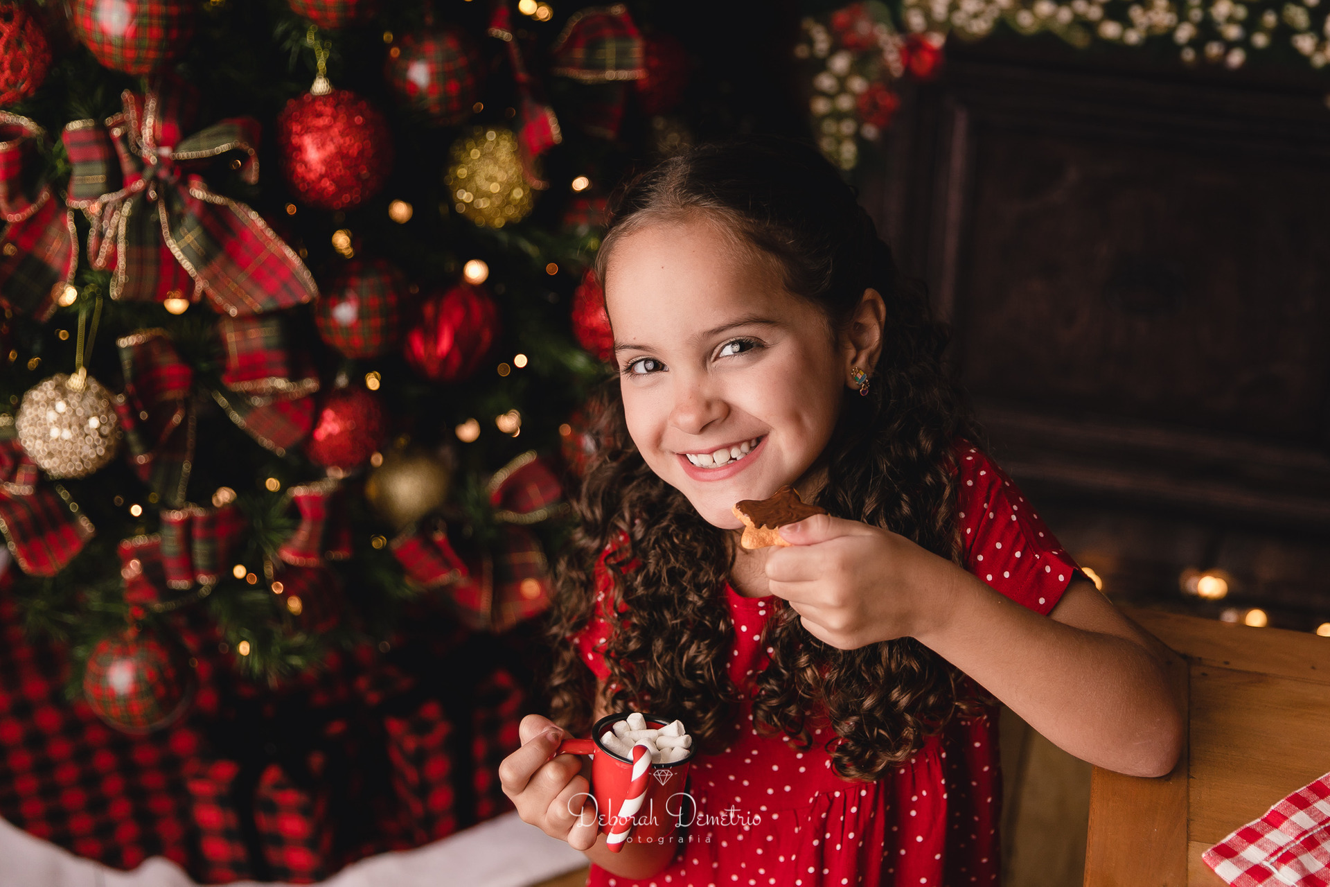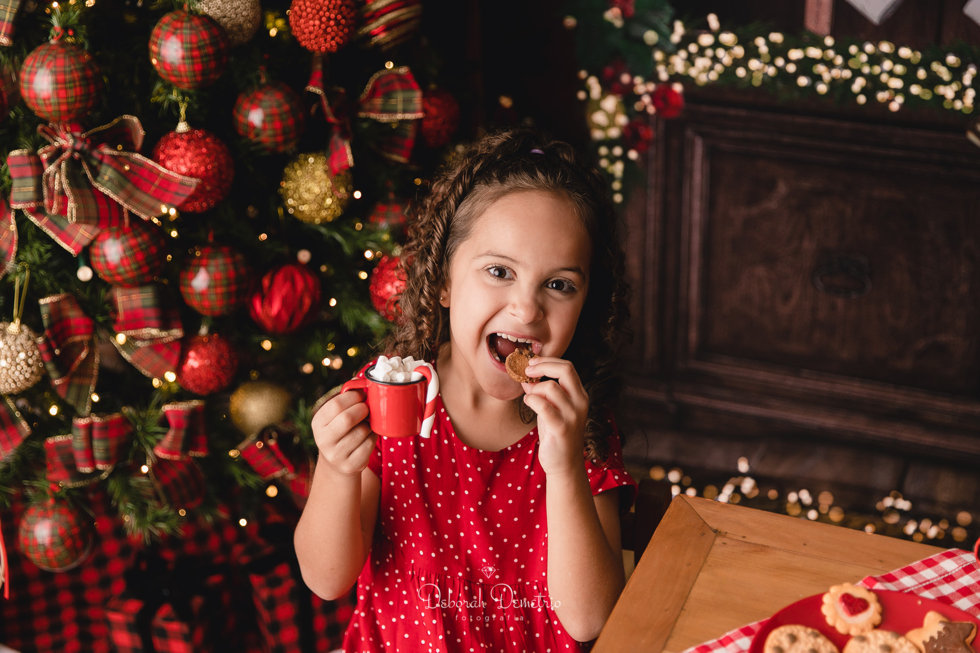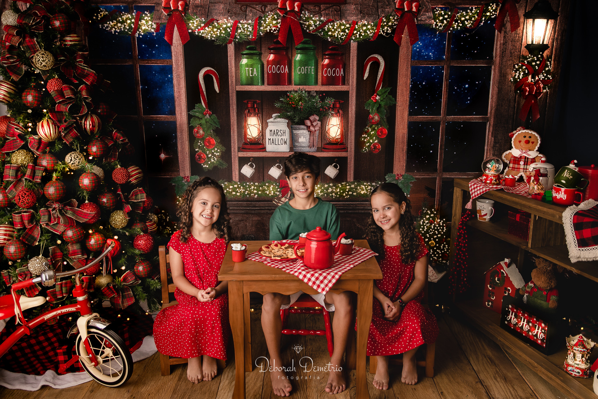 Um lindo cenário para encantar e divertir os pequenos! Criamos uma proposta mais tradicional, com as cores e elementos clássicos do Natal! Um ambiente lindo e aconchegante, com uma grande árvore, um aparador para brincar de servir e beber chocolate quente com a família e uma mesinha infantil com cadeirinhas para os pequenos sentarem e experimentarem cookies, brincarem com biscoitinhos cenográficos, bule e canequinhas, mini marshmallows… uma proposta interativa e divertida para os pequenos fotografarem brincando!